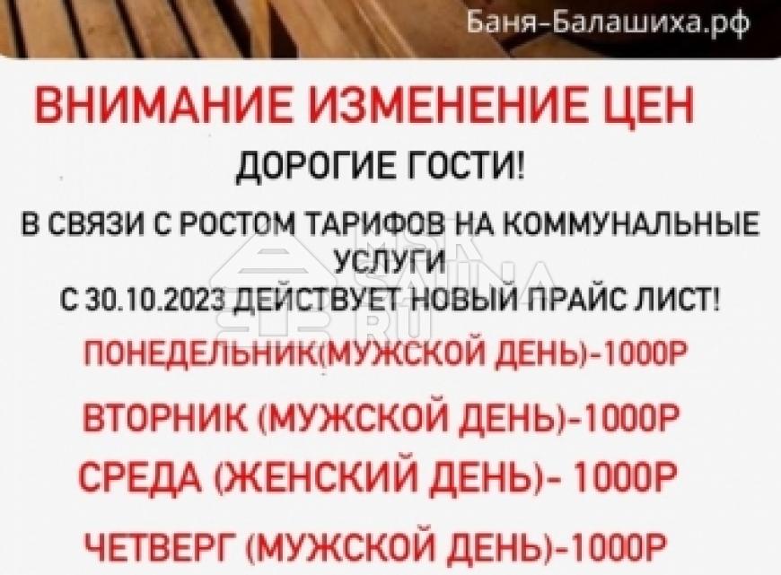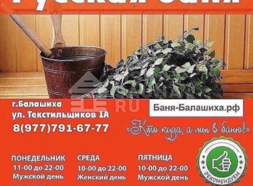 Общественные городские русские бани в Балашихе расположились на улице Текстильщиков, дом 1 А. Общая баня топится исключительно дровами, и делится на мужские и женские дни посещения. Рядом с баней протекает река Пехорка, поэтому гости банного комплекса после жаркой парной могут окунуться в прохладную воду природного водоёма, а в зимний период в прорубь, оборудованы ступеньки для спуска.